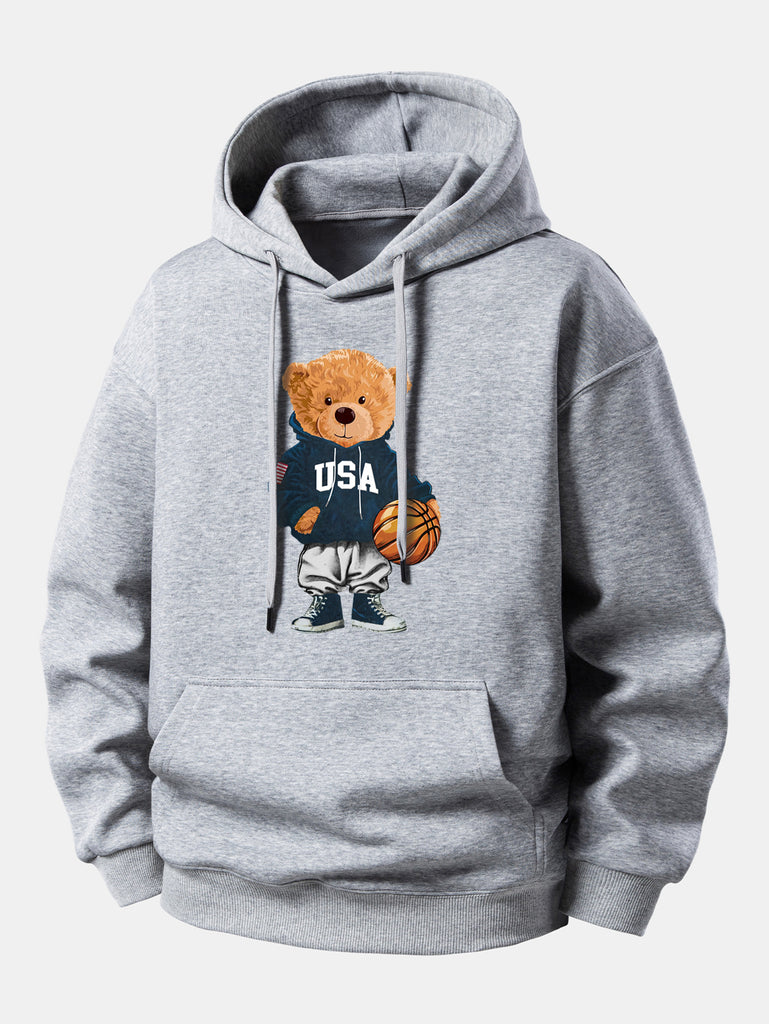 Basketball Bear Print Relax Fit Drawstring Hoodie