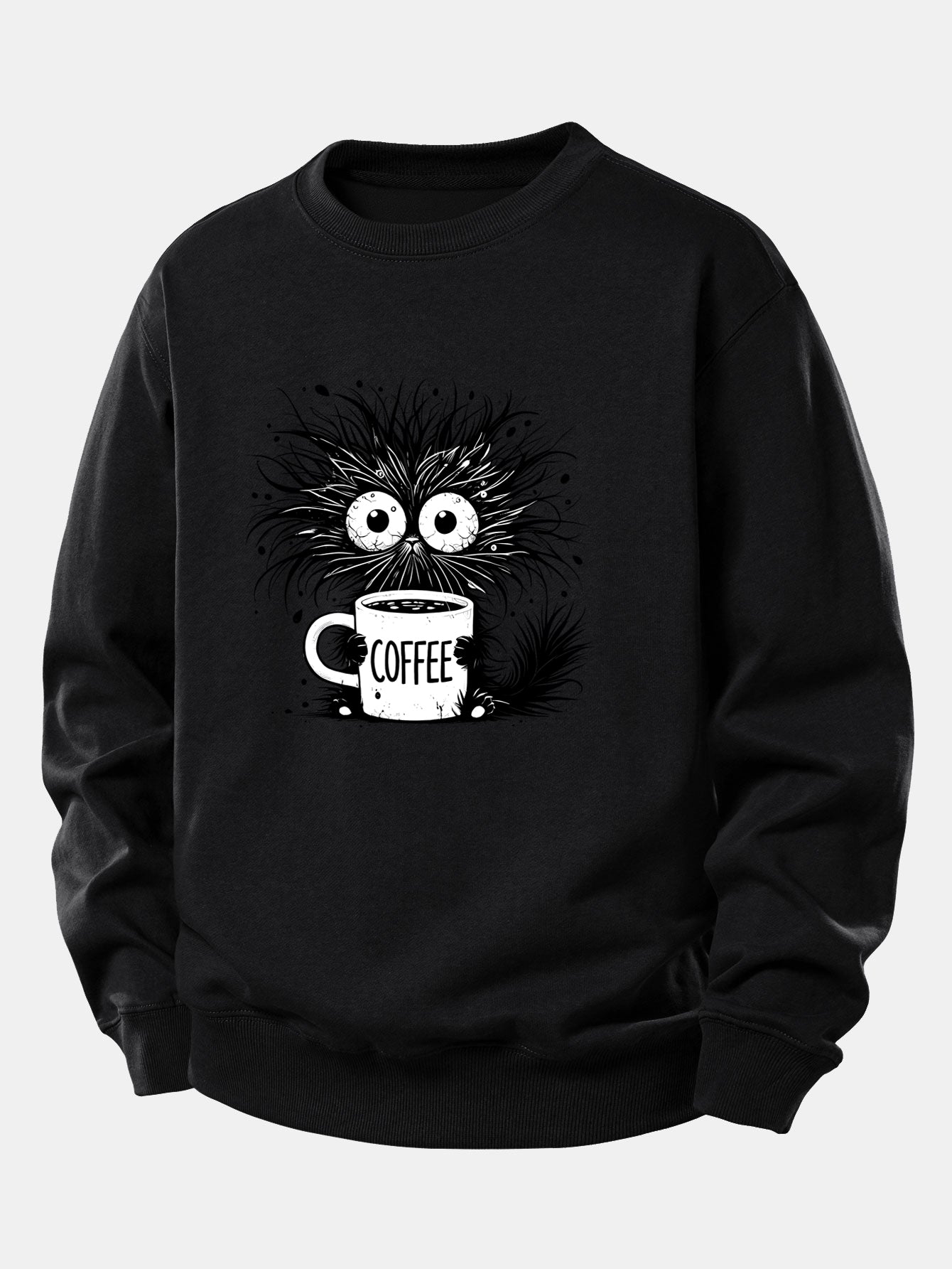Black Cat Drinking Coffee Print Relax Fit Sweatshirt