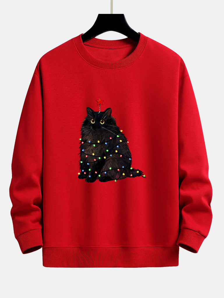 Christmas Lights Black Cat Print Relax Fit Sweatshirt